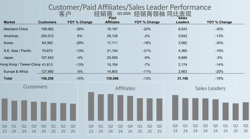 三季度客户数量方面,中国区106062人,同比2024年三季度的148402人,减少了超过4万人,同比跌幅高达29%;销售领袖从去年三季度的9348人,跌至现在的6543人,跌幅达到了30%。