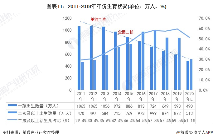 从生育孩次看,出生人口中二孩及以上比重明显高于一孩,2019年二孩及以上比重达59.5%,比上年提高2.1个百分点,但2020年,估测比例下降至51.1%,这说明“全面两孩”政策持作用红利效果正在消失。
