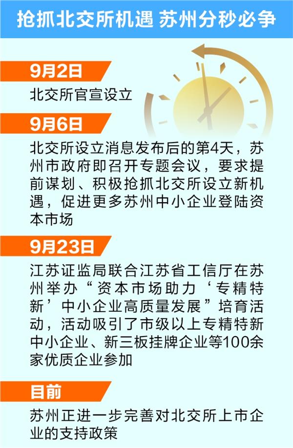 为加速对接北交所,9月6日,北交所设立消息发布后的第4天,苏州市政府即召开专题会议,要求提前谋划、积极抢抓北交所设立新机遇,促进更多苏州中小企业登陆资本市场;今年9月23日,江苏证监局联合江苏省工信厅在苏州举办“资本市场助力‘专精特新’中小企业高质量发展”培育活动,活动吸引了市级以上专精特新中小企业、新三板挂牌企业等100余家优质企业参加。
