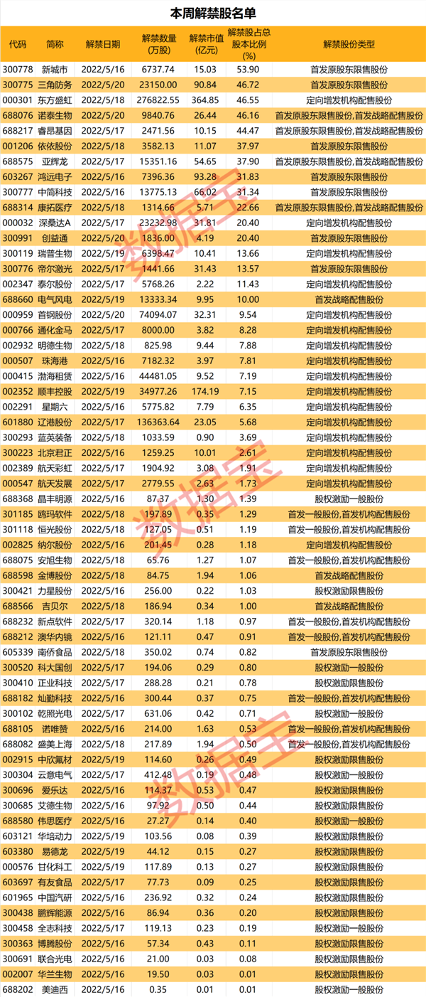 其中,新城市解禁比例居首,高达53.9%;三角防务、东方盛虹、诺泰生物、睿昂基因等4股解禁比例在45%左右。