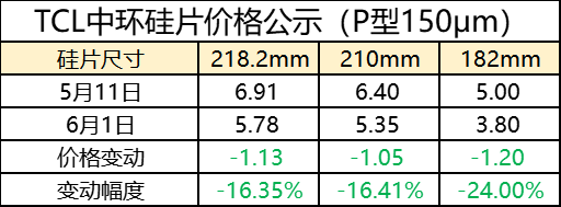6月1日,TCL中环在官微平台发布了单晶硅片最新价格。与5月11日报价相比,不同尺寸硅片价格均有大幅下降。其中,p型硅片价格降幅16.35-24.00%,n型硅片价格降幅16,41-23.97%。具体如下: