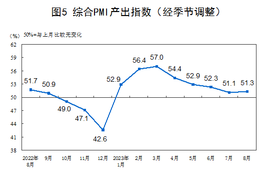 8月份,综合PMI产出指数为51.3%,比上月上升0.2个百分点,继续保持在扩张区间,表明我国企业生产经营活动总体稳定扩张。