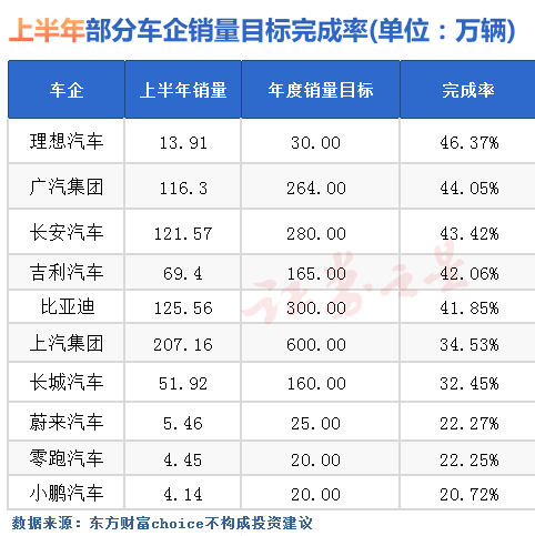 整体来看,理想汽车销量完成率较高,上半年销量13.91万台,年度目标为30万台,完成率46.37%。随着L7/L8/L9的陆续上量交付,理想汽车目前的月销量已经稳定在3万台左右,根据理想汽车的预估,第四季度的月交付量将超过4万台,如此看来完成年度目标几无悬念。