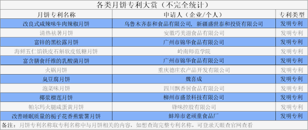 发明专利,多与月饼的馅料相关。对于很多月饼无论从外皮到馅料,水果是当仁不让的主力军,无论是传统的桃子、苹果再到大家热爱的榴莲,都有他们在月饼中的身影,毕竟月饼主打一个团圆的“甜”。