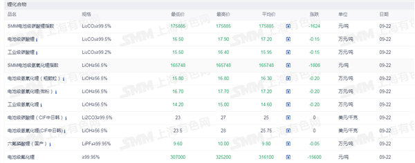 网络整理 2025-09-01 12:12证券之星新能源车行业周报:据上海有色网,截止9月22日,电池级碳酸锂16.5-17.9万元/吨,环比上一工作日下跌1500元/吨;工业级碳酸锂15.5-16.4万元/吨,环比上一工作日下滑1500元/吨。近期随着碳酸锂价格的持续下探,部分锂盐企业制造成本已被击穿,逐步调低开工,产量走低,部分厂家挺价心态渐强,跌幅有所收窄。