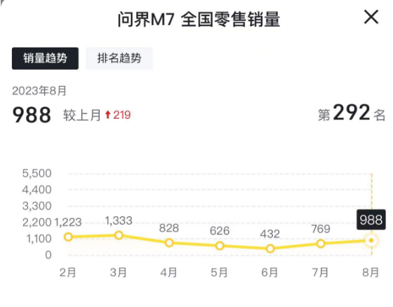 根据懂车帝的销量排行,此前华为问界M7的销量一度大跌。从年初的月销量1200多台降至6月的400多台。M7连续4个月单月销量未超过1000台,问界品牌销量也不断萎缩至万台以下。
