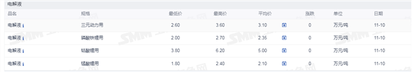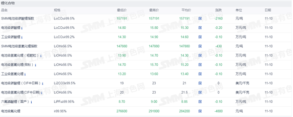 网络整理 2025-09-01 13:26证券之星新能源车行业周报:据上海有色网,截止11月10日,电池级碳酸锂14.8-15.8万元/吨,均价15.3万元/吨,环比上一工作日下滑0.2万元/吨;工业级碳酸锂14.3-14.9万元/吨,均价14.6万元/吨,环比上一工作日下滑0.1万元/吨。上游锂盐企业更多以长单出售为主,挺价心态依旧,但个别锂盐企业随行就市小幅下调出售价格,下游正极材料企业出于降本增效策略,其散单拿货情绪也依旧低迷,近期碳酸锂现货市场成交价格仍呈现下行趋势。