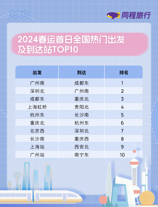 网络整理 2025-09-01 21:011月26日,2024年春运正式启动。同程旅行平台数据显示,春运第一天全国出发客流量较大的铁路站点主要有:广州南、深圳北、成都东、上海虹桥、杭州东、重庆北、北京西、长沙南、上海站、广州站等。1月26日当天到达客流量较大的铁路站点主要有:成都东、广州南、重庆北、贵阳北、长沙南、杭州东、深圳北、重庆西、西安北、南宁东等。