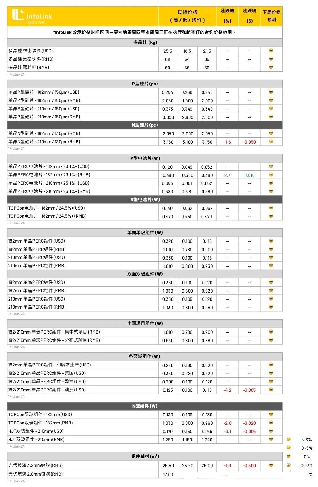 海外部分,当前主要热点在受红海事件影响欧洲区域的运费上升,折算运价约每瓦0.011-0.015欧元不等。欧洲区当前FOB价格与前期相似故现货表中并无呈现变动,主要变动在于受运价影响CIF/DDP/DAP条款价格调涨,因风险因素考量,欧洲签订DDP/DAP条款订单增加较多。2024年欧洲交付主要以TOPCon组件为主,折算FOB价格约0.105-0.11欧元,而分销部分TOPConFOB价格约0.115-0.125欧元,其中与PERC项目差距约0.005-0.01欧元,黑背板组件约1-2欧分的溢价空间。