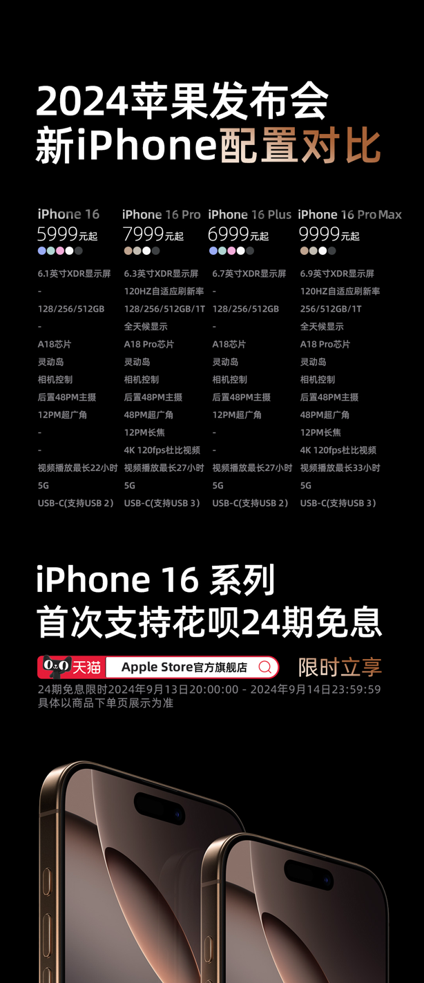 网络整理 2025-11-17 04:25今日,苹果最新iPhone16系列发布。该系列四款机型将于9月13日20时起,在苹果天猫期舰店首发预售,预售前28小时,支持花呗24期分期免息购买。这是苹果首次在发新期间支持花呗24期分期免息。以基础128G款iPhone16为例,消费者使用花呗24期分期免息购买,每个月仅需支付约250元。