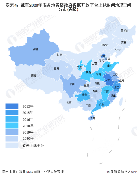 截至2020年底,全国各地上线的省级政府数据开放平台的地区分布如下图所示,颜色越深代表平台上线时间越早,灰色表示该地区还未上线平台。从整体上看,我国地方政府数据开放平台已从东部地区向中西部地区不断扩散,东南沿海地区的省级平台已经基本相连成片。