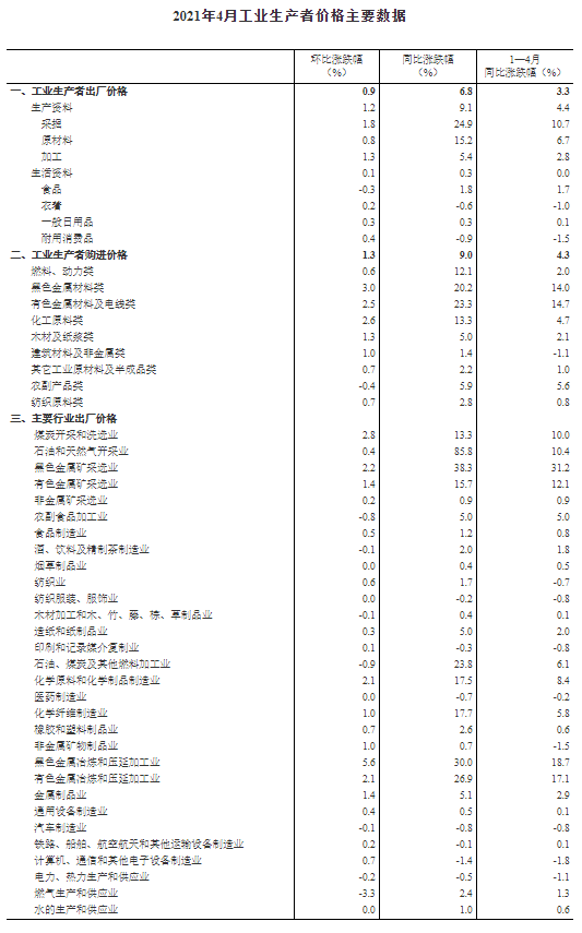 网络整理 2025-11-30 03:53(原标题:中国4月CPI同比涨0.9%,PPI涨幅扩大至6.8%,大宗商品涨价影响明显)