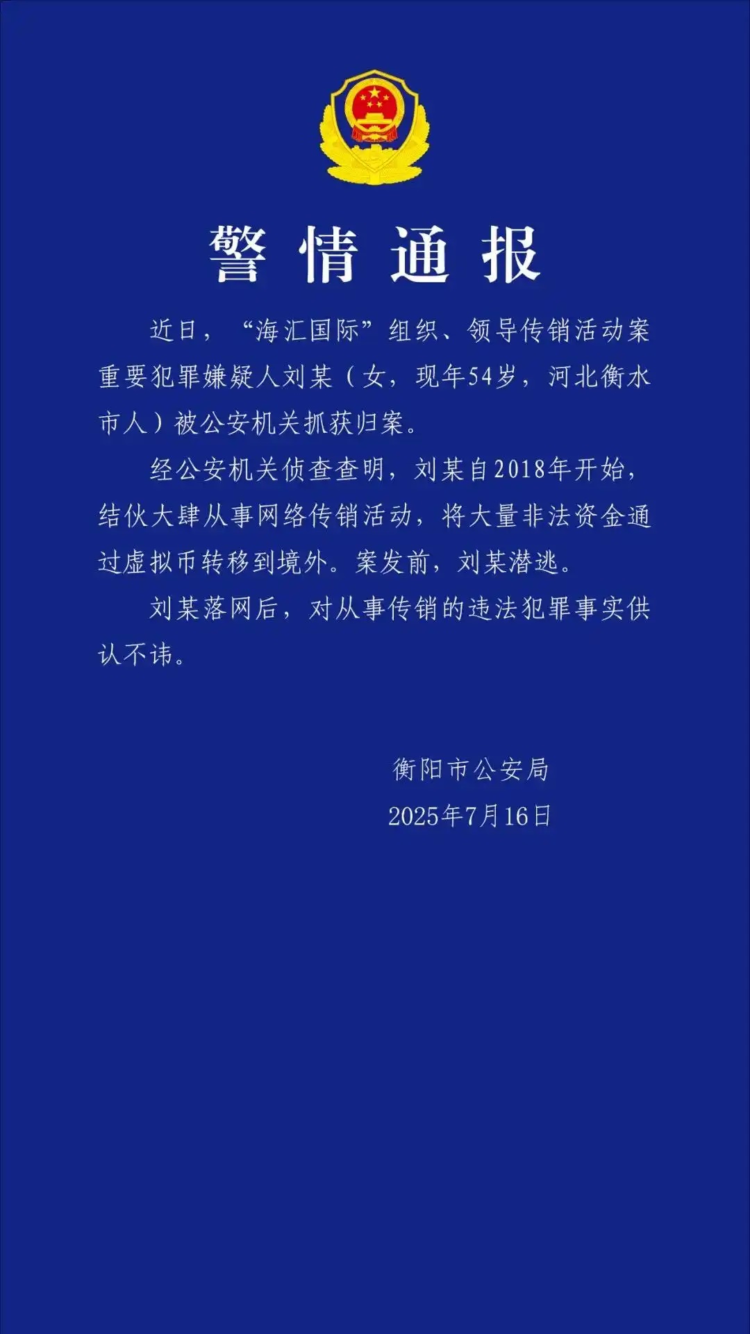 衡阳警方:海汇国际传销案重要犯罪嫌疑人刘某被抓获归案