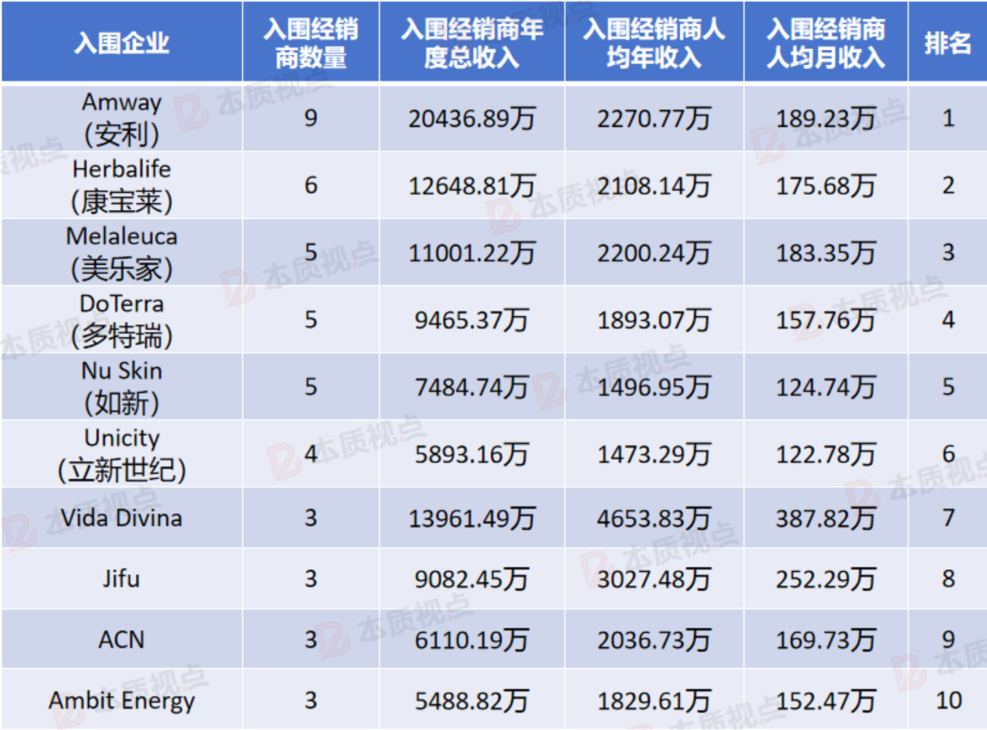 不出所料,安利公司以9名入围经销商的数量拔得头筹,9位入围直销商年度总收益高达20436.89万元,人均2270.77万元。