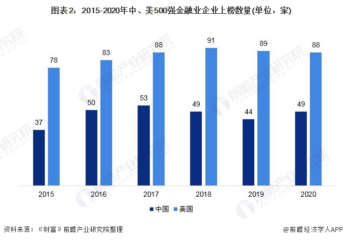 在“财富中国500强”中,我国金融业上榜企业数量呈先增长后下降的趋势,2020年上榜企业数量为41家,较2019年下降3家。“《财富》美国500强”榜单中,美国金融业上榜企业数量较为稳定,基本保持在90家左右,2020年上榜企业数量为88家,较2019年下降1家。
