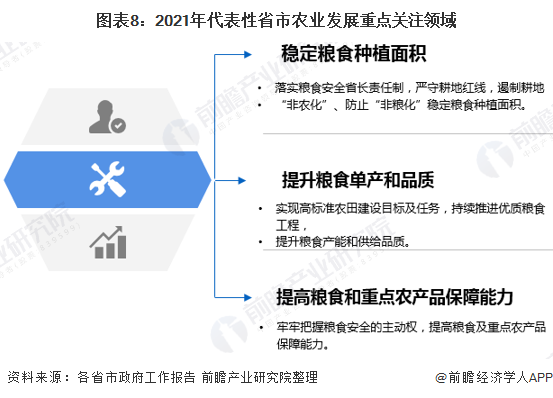 具体看,2021年各地区政府工作报告主要关注稳定粮食种植面积、提高粮食单产和品质及提高粮食粮食和重点农产品保障能力几大领域。