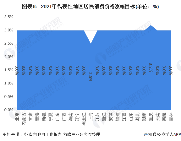 2021年政府工作报告中,全国居民消费价格涨幅目标为3%,从多个省份政府工作报告披露的数据看,除上海市居民消费价格涨幅目标为2.5%低于全国水平,重庆居民消费价格涨幅目标为3.2%,高于全国水平,其余多个省市居民消费价格涨幅基本与全国3%保持一致。