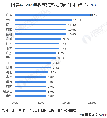 固定资产投资是经济增长三驾马车之一,是促进地区经济增长,调整产业结构的关键指标,也是各地区政府的重要关注领域。2021年代表性地区政府工作报告中,广西、云南、吉林、辽宁、海南、新疆六省份目标投资增长超过10%,其中广西2021年固定资产投资目标最高为15%。